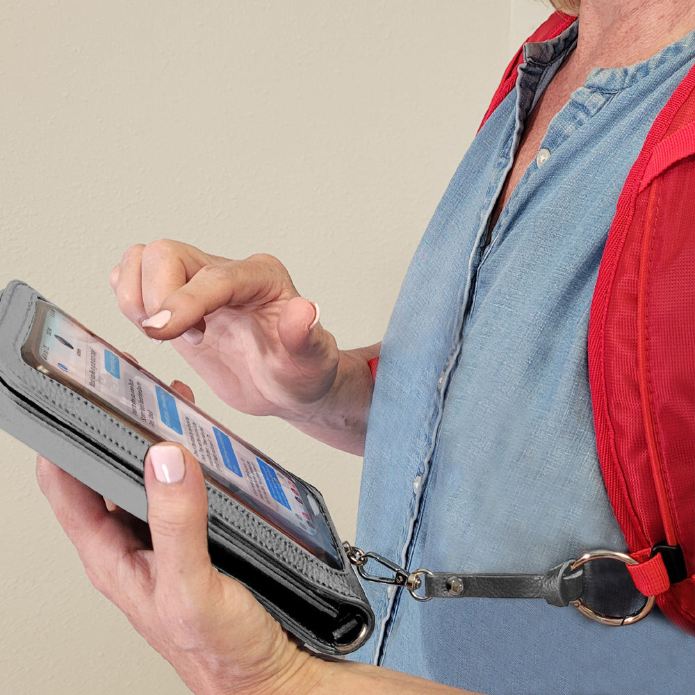 Experience the convenience of a Touch Screen Purse, simply by clipping our Swing Along to your current purse, tote, or backpack! No purse, no problem, just clip it to your belt loop and go! Easily switch to the provided shoulder strap and turn your Swing Along into a crossbody purse, complete with three credit card slots and a hidden cash pocket! Just Clip and Go!